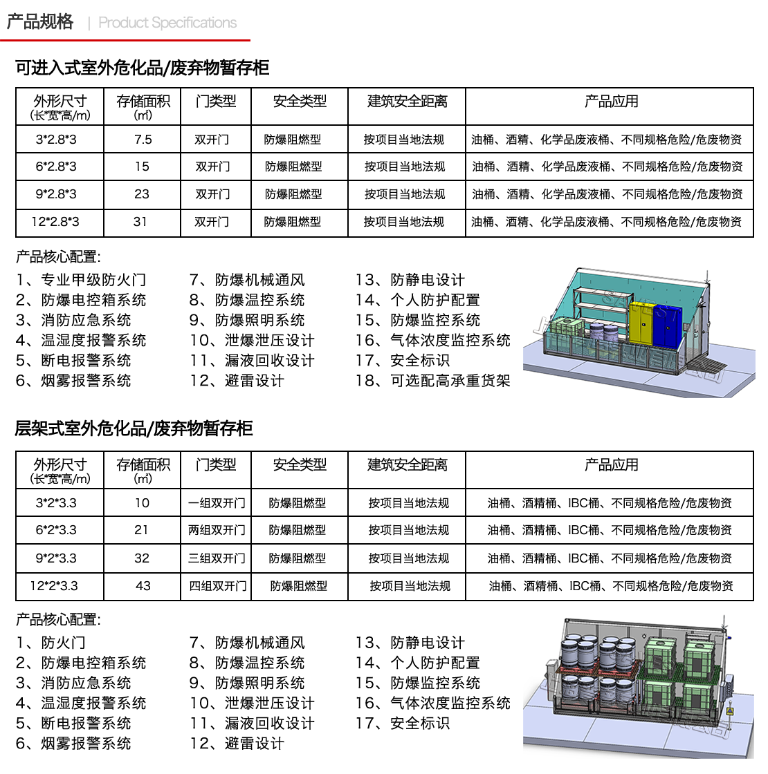 2.防爆功能:本产品可满足易燃易爆化学品在储存过程中出现的爆炸冲击力控制功能,产品顶部配备泄爆口,可出具防爆测试报告,参考标准:GB3836.1-2010 、GB3836.8-2014 爆炸性环境;