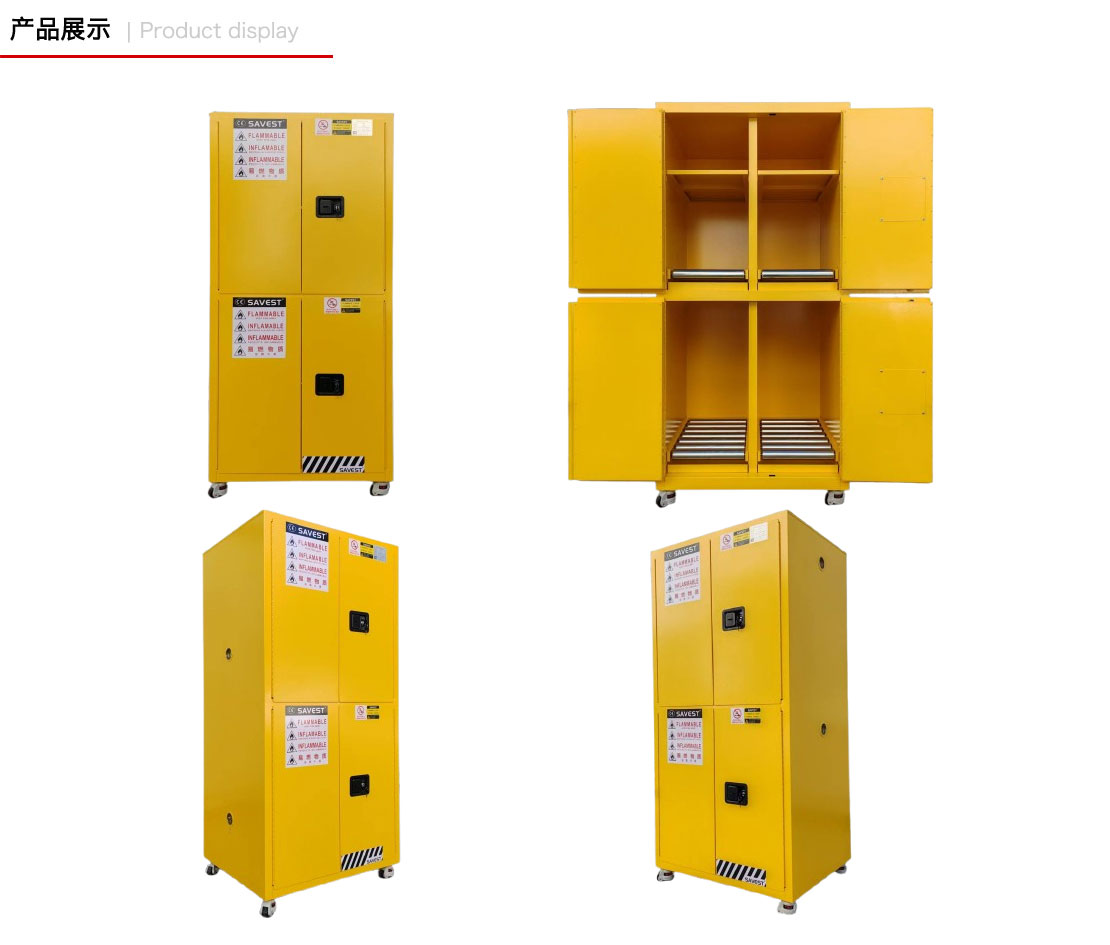 1. SAVEST易燃液体防火安全柜由双层优质冷轧钢板通过点焊接构造,两层钢板之间相隔有38mm的防火阻燃层;