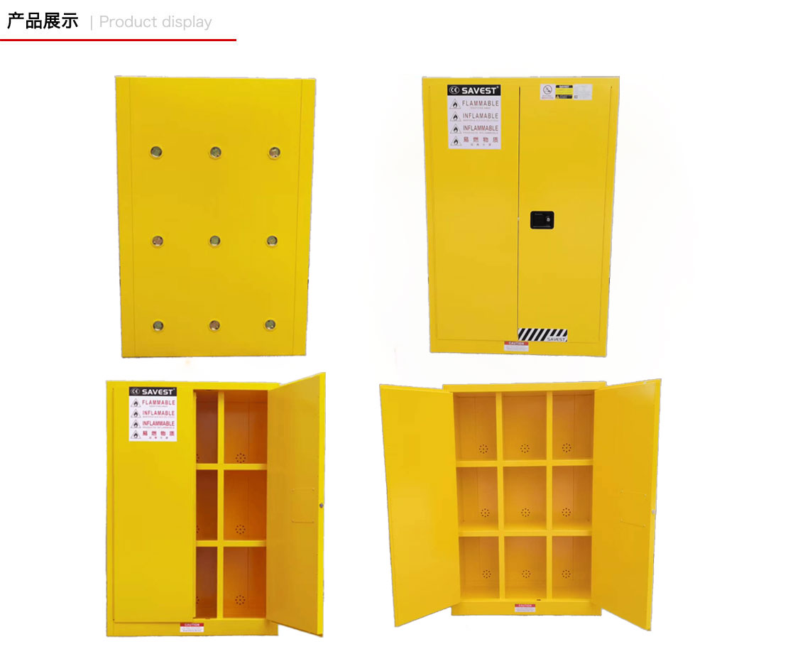 1. SAVEST易燃液体防火安全柜由双层优质冷轧钢板通过点焊接构造,两层钢板之间相隔有38mm的防火阻燃层;