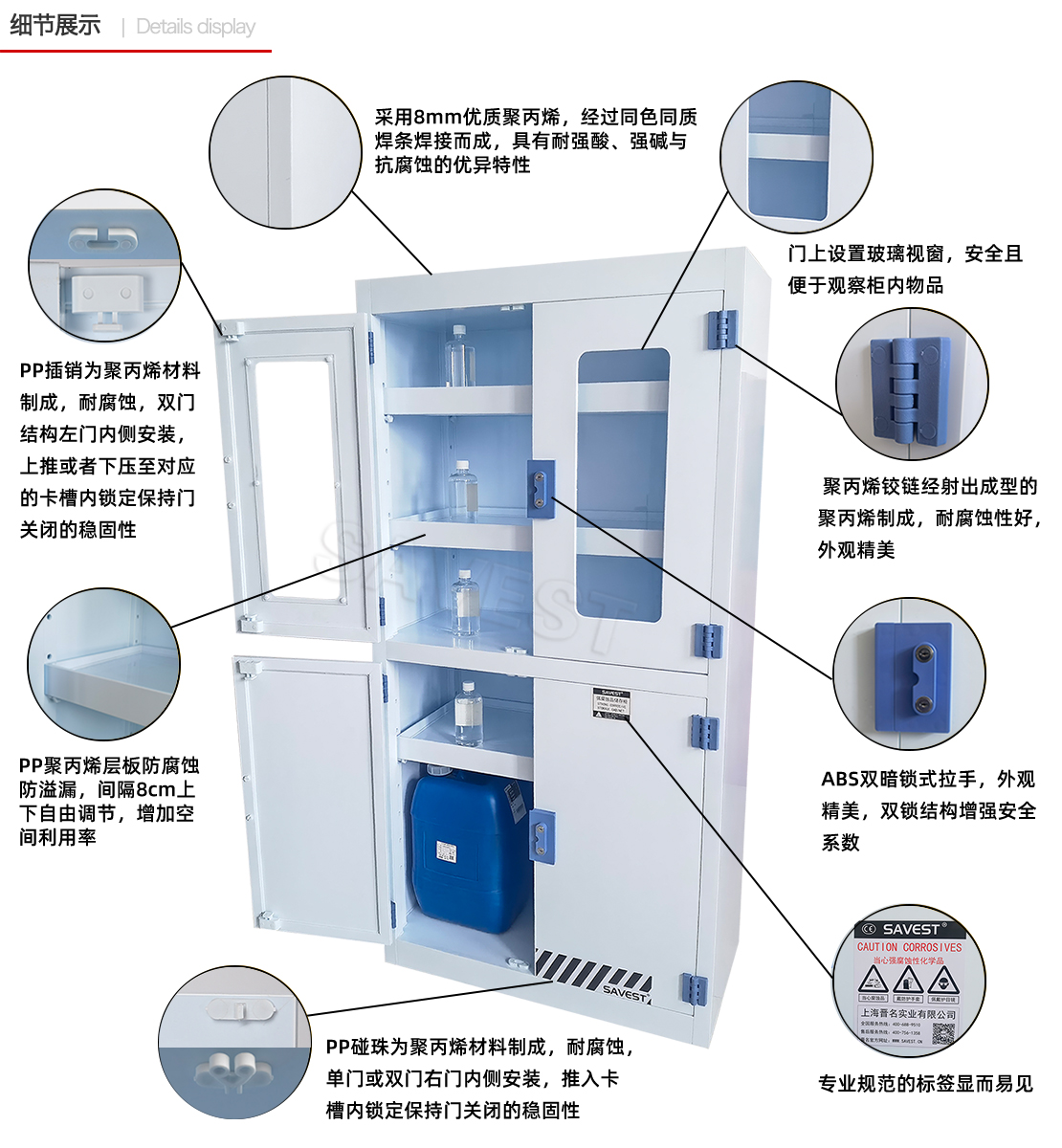 1. SAVEST药品存储柜采用8mm厚PP板材,经过同色同质焊条焊接而成,具有耐强酸,强碱与抗腐蚀的优异特性;