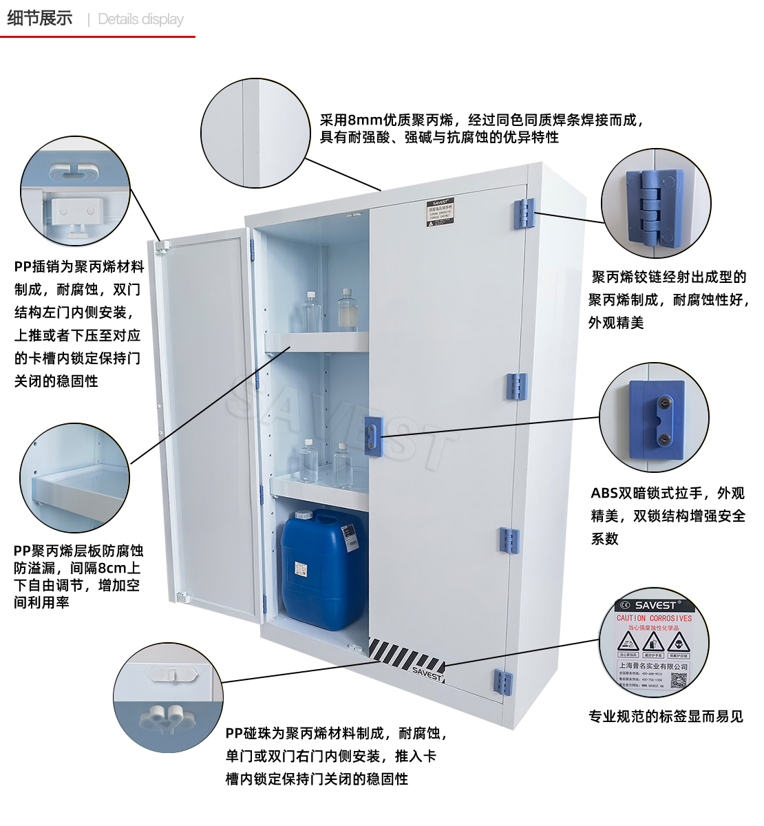 1. SAVEST强酸碱储存柜采用8mm厚PP板材,经过同色同质焊条焊接而成,具有耐强酸,强碱与抗腐蚀的优异特性;