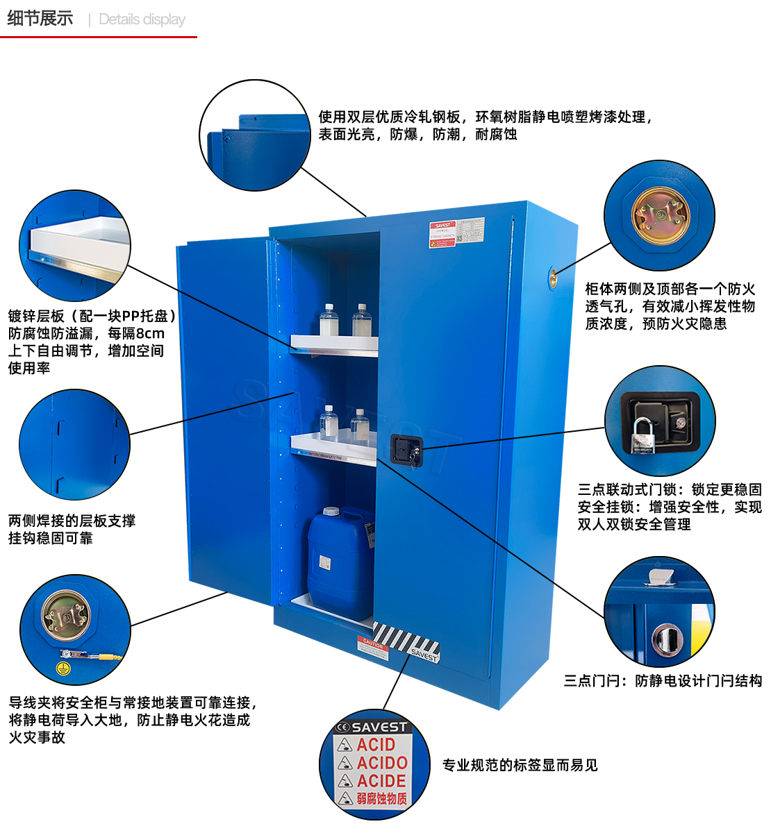 1. SAVEST弱腐蚀性液体防火安全柜由双层优质冷轧钢板通过点焊接构造,两层钢板之间相隔有38mm的防火阻燃层;