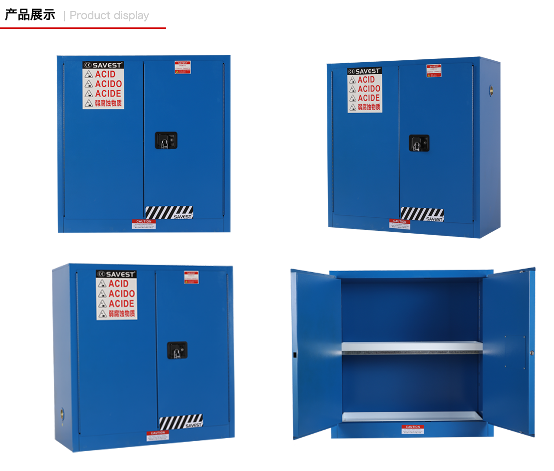 1. SAVEST弱腐蚀性液体防火安全柜由双层优质冷轧钢板通过点焊接构造,两层钢板之间相隔有38mm的防火阻燃层;