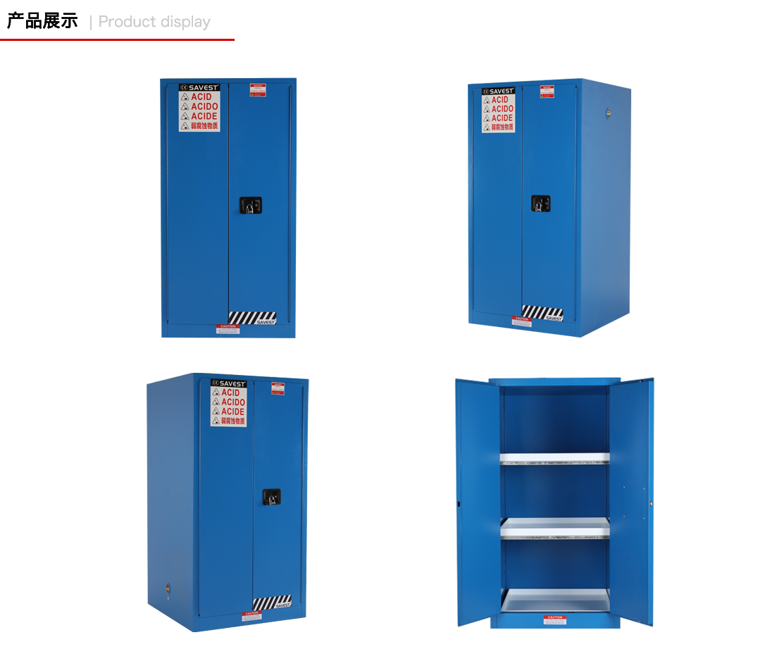 1. SAVEST弱腐蚀性液体防火安全柜由双层优质冷轧钢板通过点焊接构造,两层钢板之间相隔有38mm的防火阻燃层;