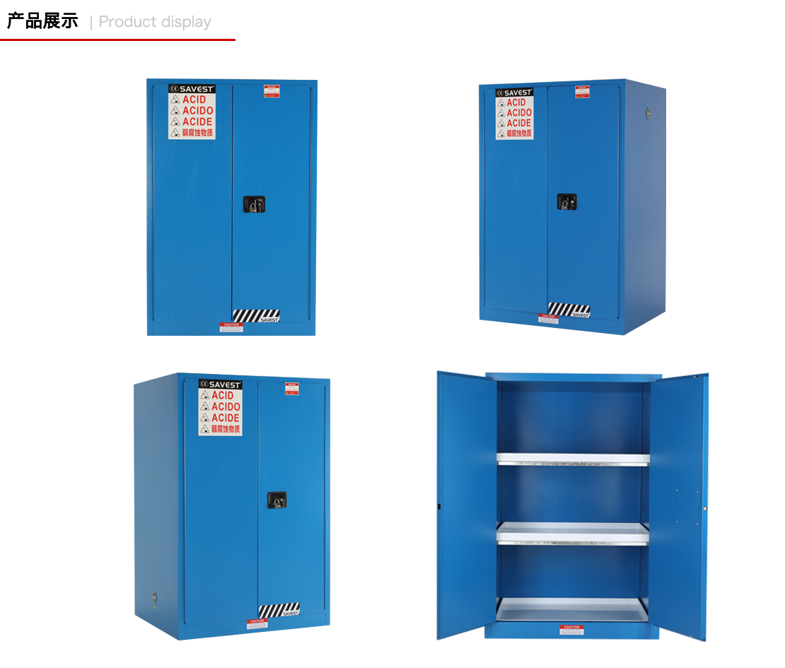 1. SAVEST弱腐蚀性液体防火安全柜由双层优质冷轧钢板通过点焊接构造,两层钢板之间相隔有38mm的防火阻燃层;