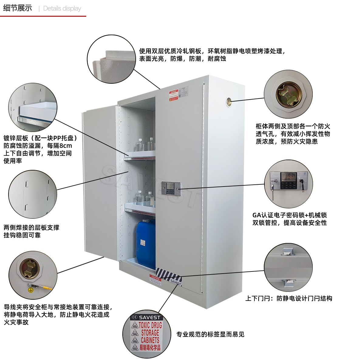 1. SAVEST易制毒品储存柜由双层优质冷轧钢板通过点焊接构造,两层钢板之间相隔有38mm的防火阻燃层;